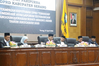 Hal ini terungkap pada Rapat Paripurna DPRD Kabupaten Serang Penyampaian Keputusan DPRD Terhadap Rekomendasi atas Laporan Keterangan Pertanggungjawaban (LKPJ) Bupati Serang Tahun Anggaran 2025 di gedung dewan setempat pada Rabu, 22 April 2026.