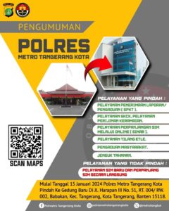 Sentra Pelayanan Kepolisian Terpadu (SPKT) Polres Metro Tangerang Kota resmi berpindah ke lokasi baru mulai Senin, 15 Januari 2024. Gedung baru tersebut berada di Jalan Harapan III No.51 RT.004/ RW.002, Babakan, Kecamatan Tangerang, Kota Tangerang, Banten 15118, di belakang TangCity Mall.